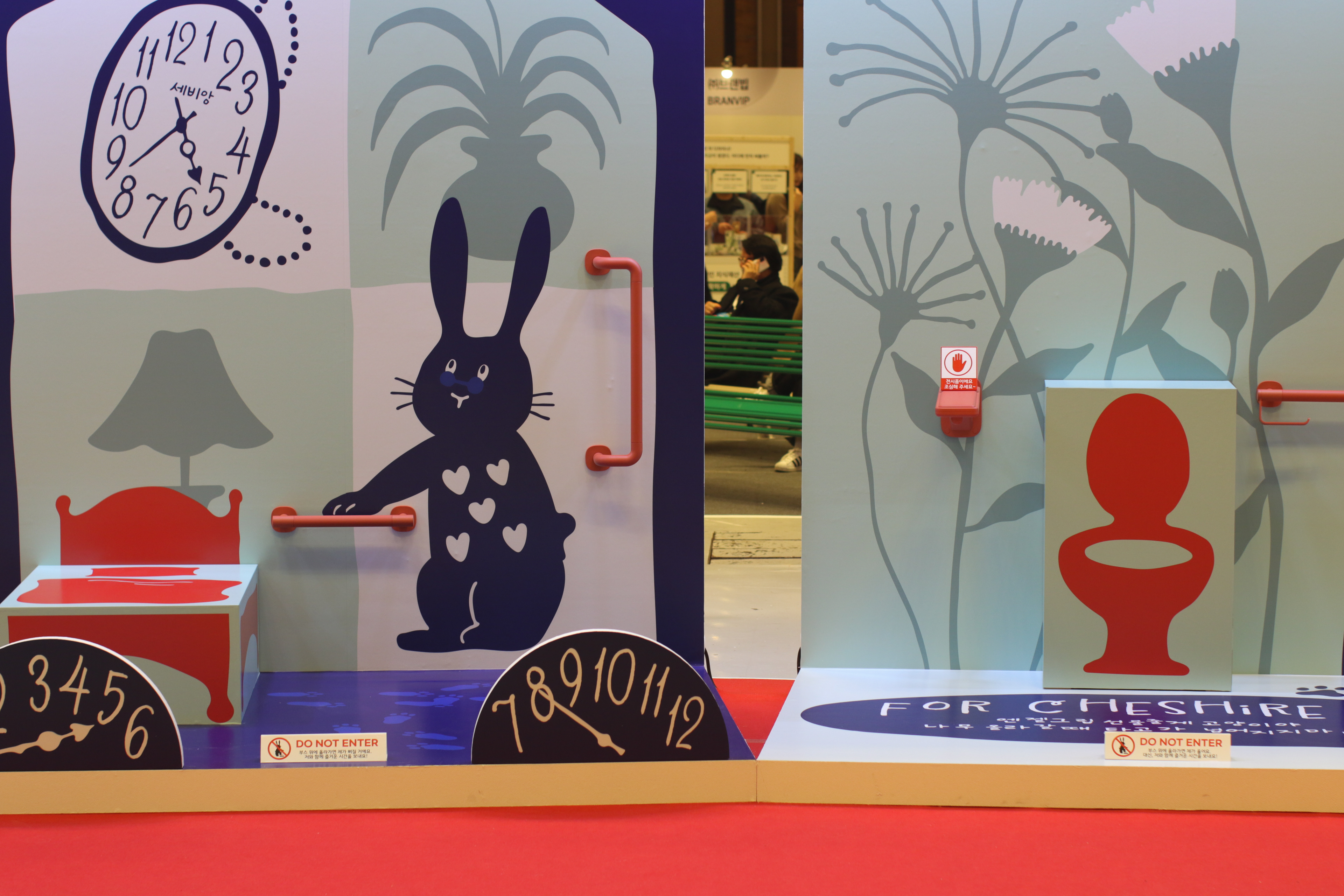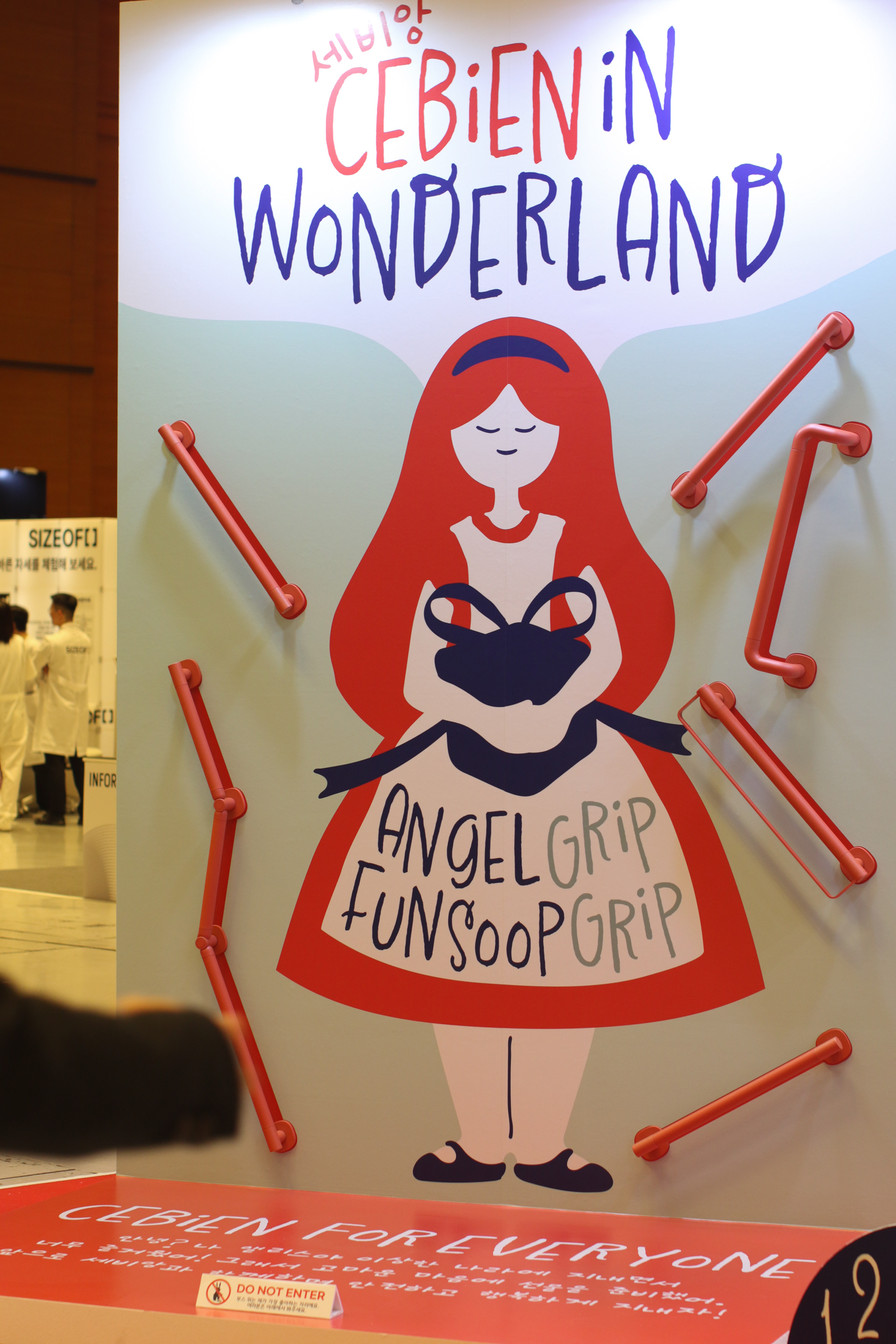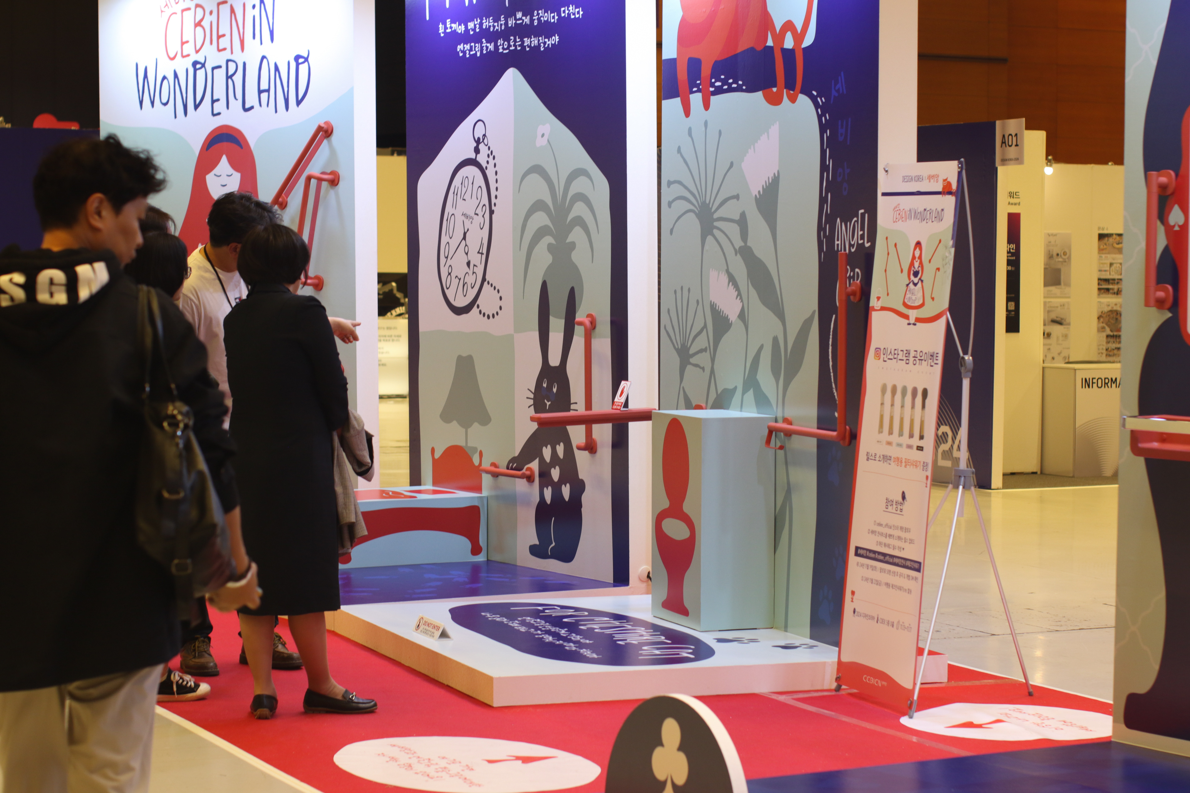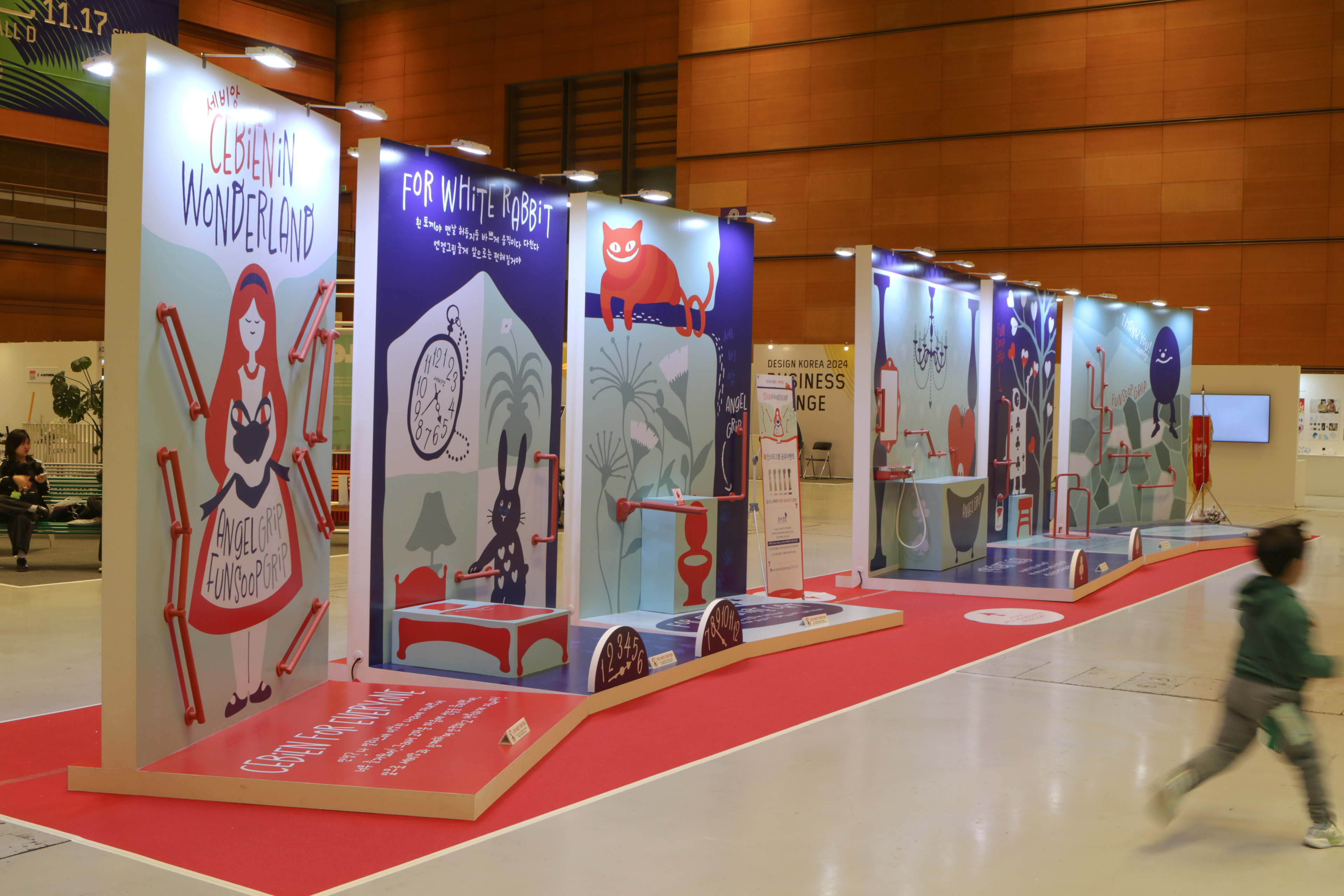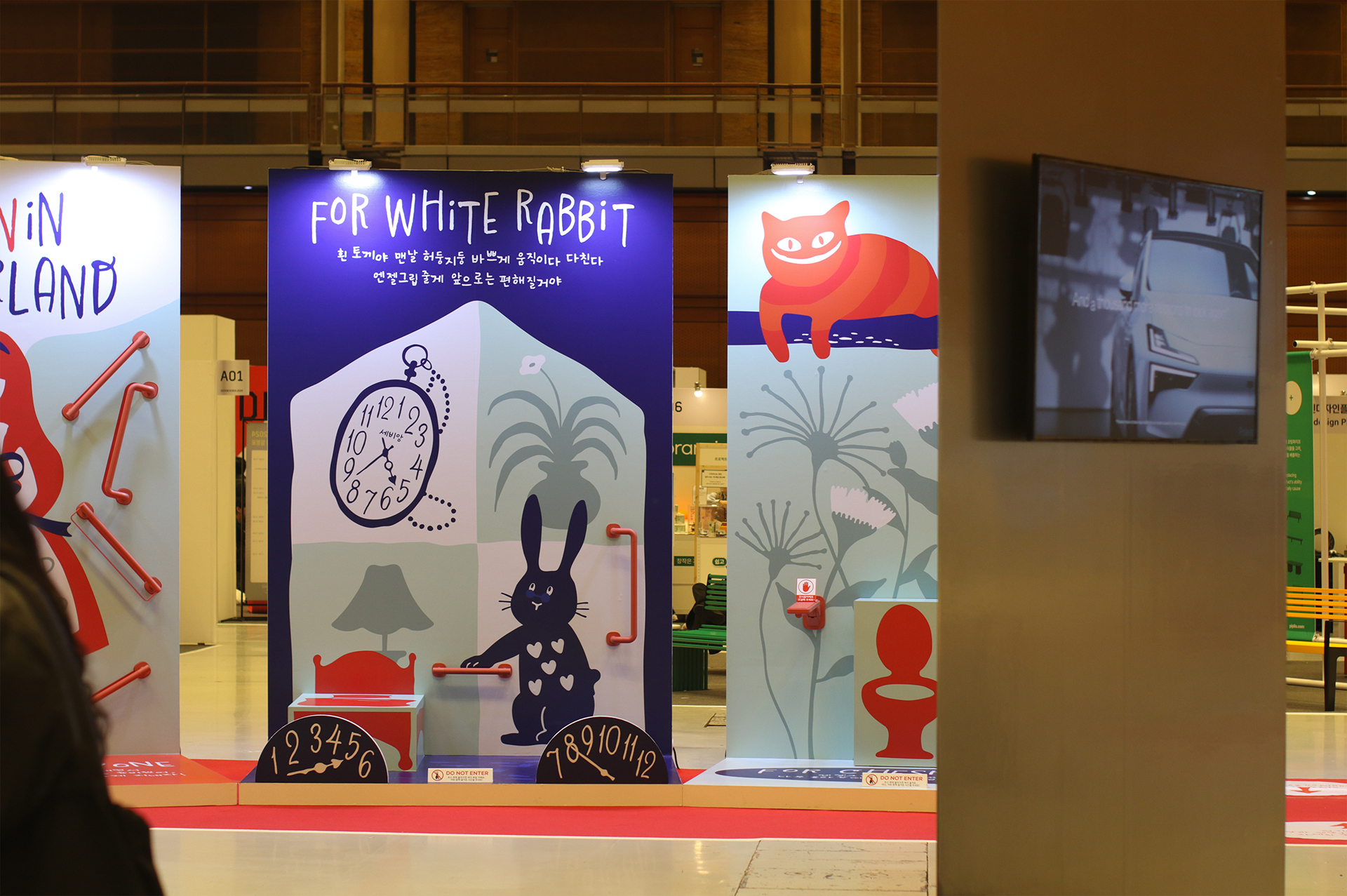 Cebian’s signature red was used as the key color, ensuring that the red grab bar products stood out prominently throughout the exhibition. Illustrations were created using characters from Alice in Wonderland as visual motifs, bringing the narrative concept to life.